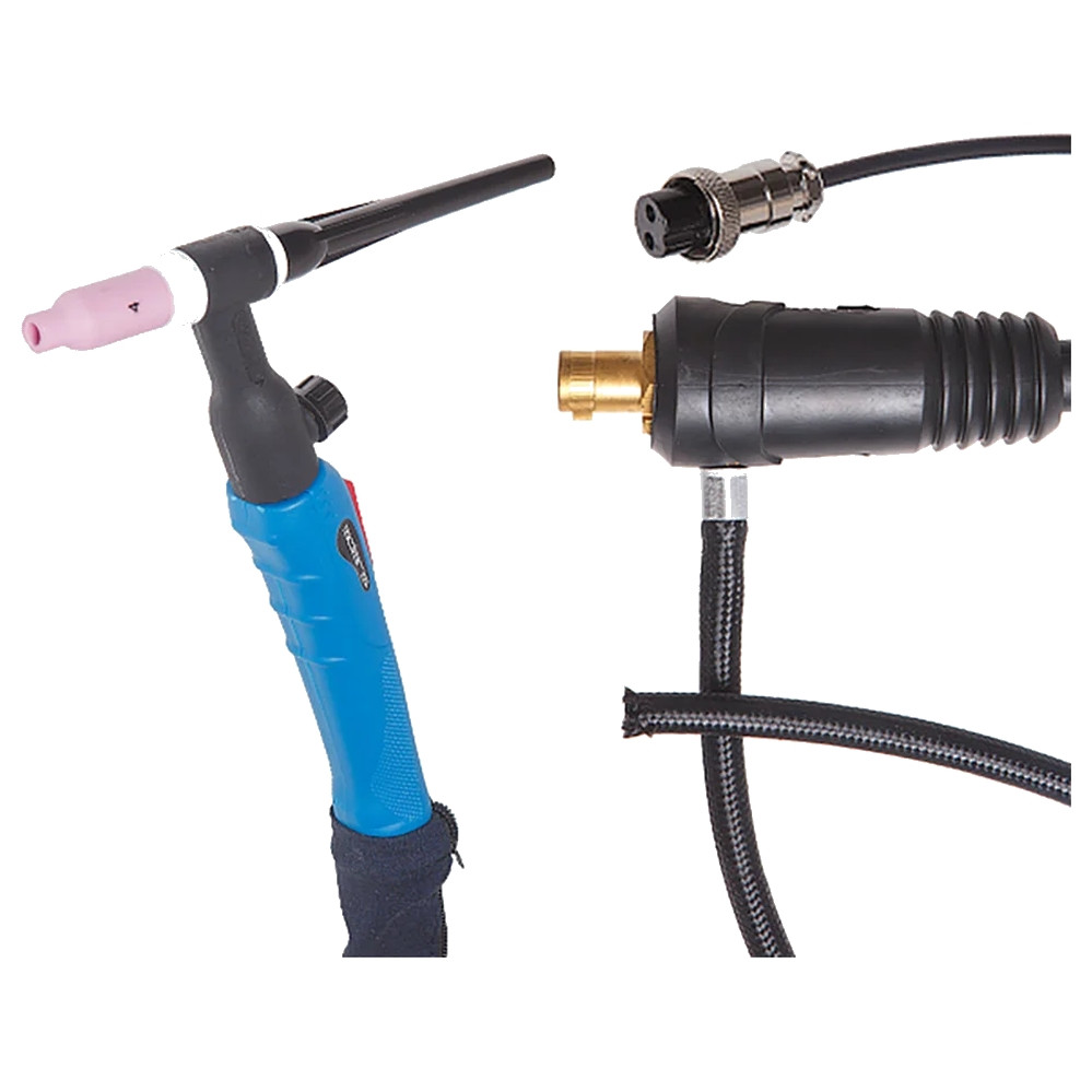Горелка сварочная SOLARIS TIG WGT-26V 4м, 250А WGT-26V450 - оснащена рукавом с универсальным байонетным разъемом 35-50 (13мм). Разъем кнопки управления – 12мм, есть газовый вентиль. Продолжительность включения на максимальном токе – 60%. Длина газового шланга от разъема составляет 2.5м. Оборудована эргономичной ручкой, позволяющей выполнять мелкие, точные работы. Горелка может работать как с контактным поджигом, так и с бесконтактным, это зависит от аппарата, к которому горелка подключена.